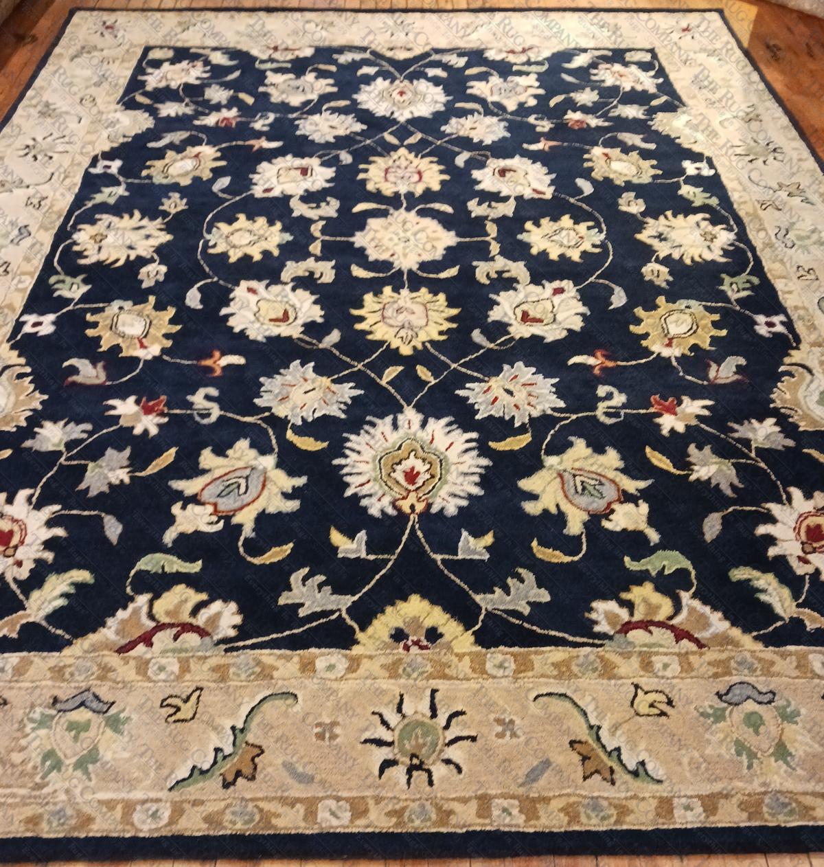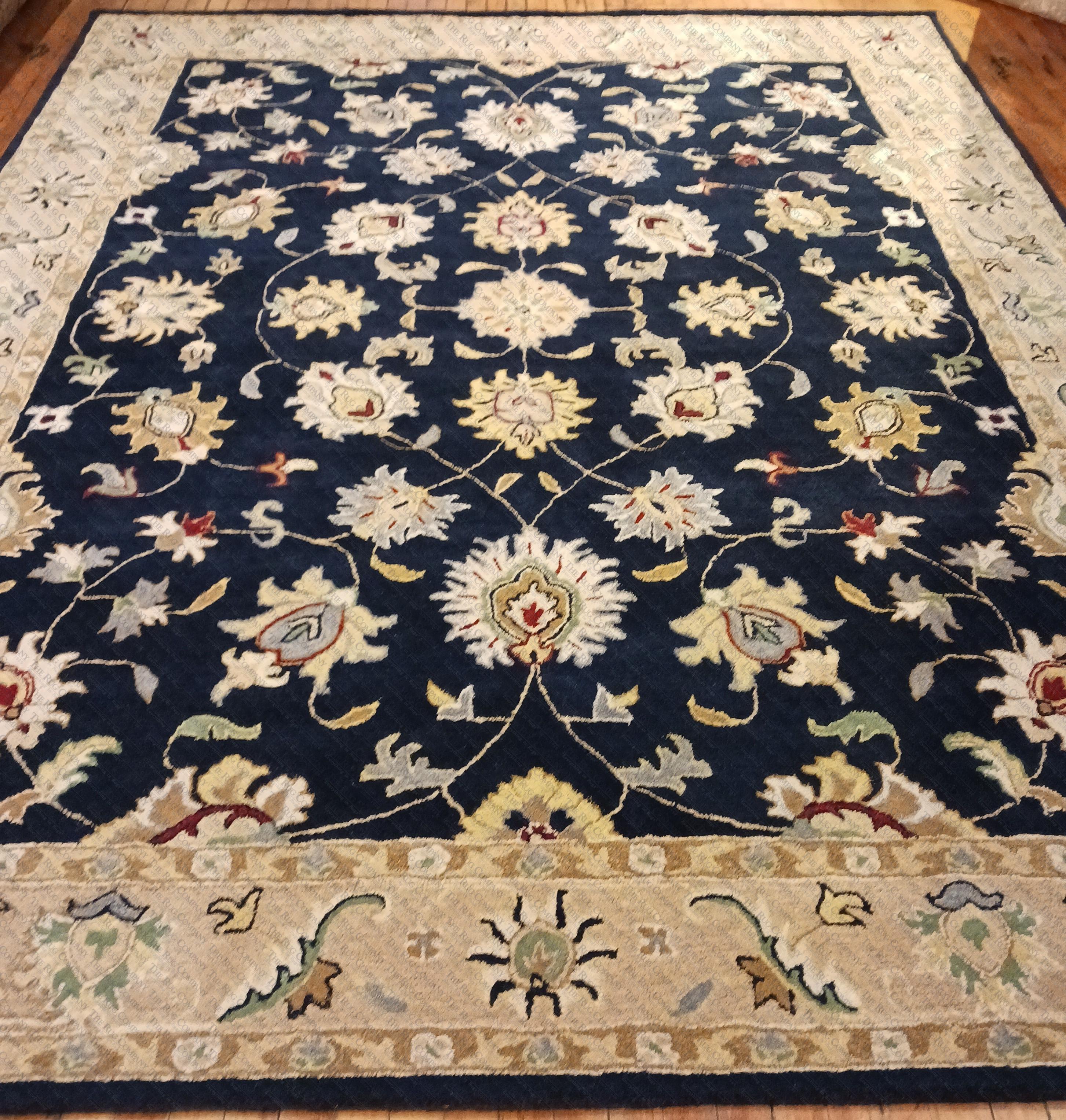100% Wool Tufted India, Other sizes 3'6x5'6, 5x8', 9x12, 10x14, 2'6x8 Runner, Custom sizes. In person this is more of a Royal Navy. Theme: OrientalShape: RectangularColors: BlueCreamDark IvoryGoldMulti-coloredNavySageTaupeWeave: TuftedFiber: WoolRegular price: $1,600.00Sale price: $1,199.00