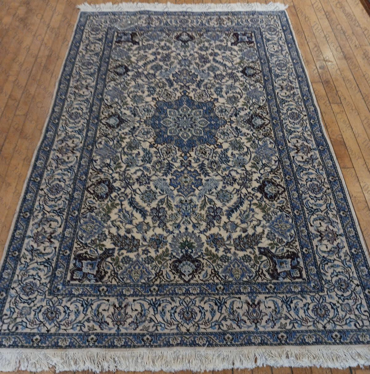 Wool with Silk accents finely Hand Knotted, Iran Theme: OrientalShape: RectangularColors: BlueBrownCreamGoldGreenMulti-coloredWeave: Hand KnottedFibers: SilkWoolSale price: $950.00